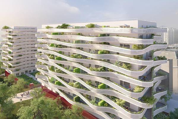 ECDM Architectes conceived the two housing structures of ‘ZAC du coteau’ with visually and functionally distinctive curving balcony layouts. Located in Arcueil, France, each floor plate extends beyond the building volume with undulating geometry, creating up to 3.2 meter cantilevers for large patios off of each apartment. This produces an identifying dynamic overall form, while offering the residents ample outdoor space. The complex is made up of 101 owned-townhouses and 40 social-housing units…
